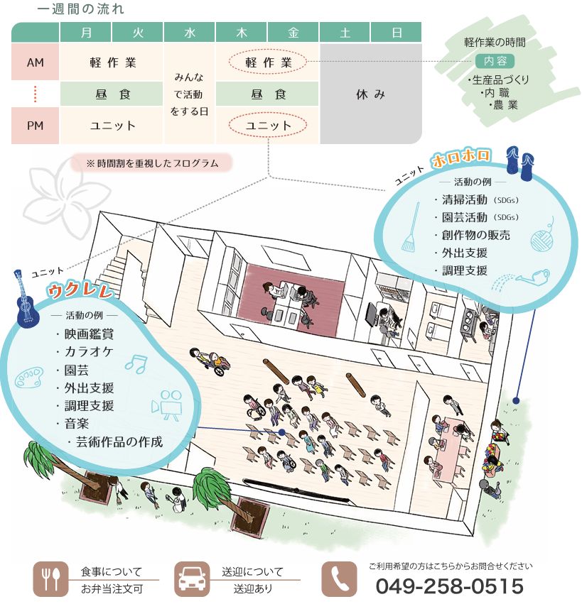 | ユニット活動 | ホロホロユニット(体を動かす活動) 園芸、外出、清掃、調理など ウクレレユニット(ゆったり自分のペースで活動) 映画鑑賞、音楽活動、創作など |