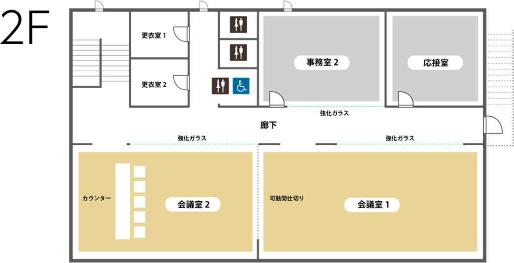 - 2F 部分のほとんどのスペースを職員、学生、地域住民に開放